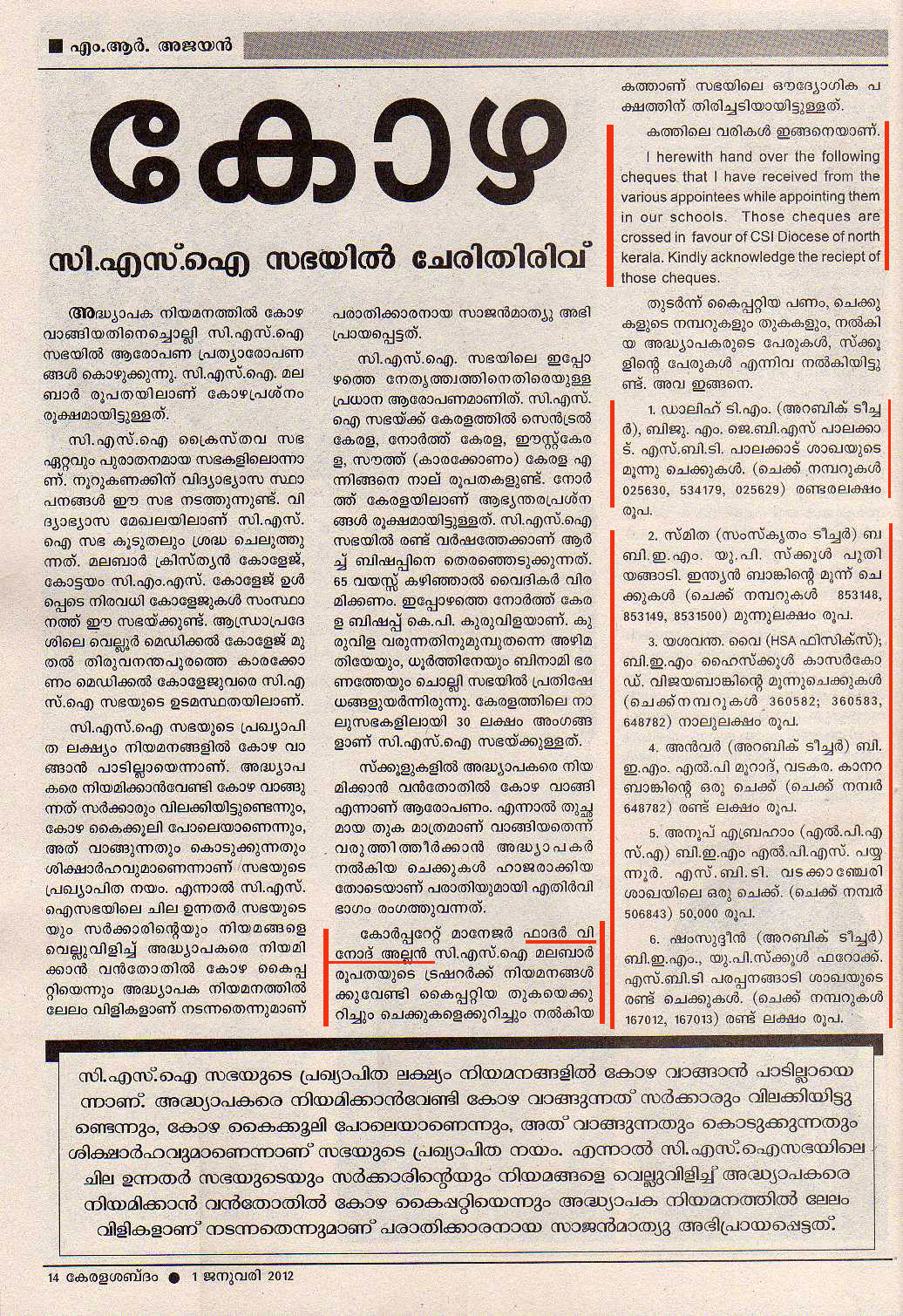 இப்போதுள்ள CSI மாடரேட்டர் Most Rev.வசந்தகுமார்அவர்கள் கதையும் அதுதானே! தன் பெயரிலும், தன் மனைவிபெயரிலும் பேங்கில் கணக்கு தொடங்கி திருமண்டலத்திற்கு சேரவேண்டிய பலவித பணவரவுகள் தன் கணக்கில்கோடிக்கணக்கில் சேர்க்க ஏற்பாடு செய்ததால்தானே இப்போது போலீஸ் வளையத்துக்குள் அகப்பட்டு ஒவ்வொரு முறையும் கைது செய்ய கோர்ட் கட்டளையிட்டபோது, பலமுறை ஜாமீன் வாங்கி உலாவிக் கொண்டிருக்கிறார்.