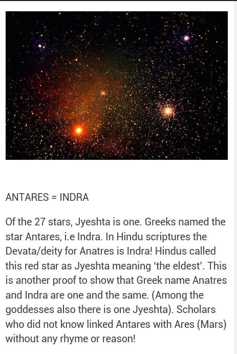 ஜேஷ்ட நக்ஷத்ரத்தின் அதிதேவதை இந்திரன் என்றனர் நம் முன்னோர். அதே போல் கிரேக்கரும் அதை அந்தரஸ் என்றனர்...அதாவது இந்திரன் என்பது அவ்வாறு மருவியுள்ளது.இந்திரவழிபாடு உலகில் எல்லா இடங்களிலும் இருந்துள்ளது.